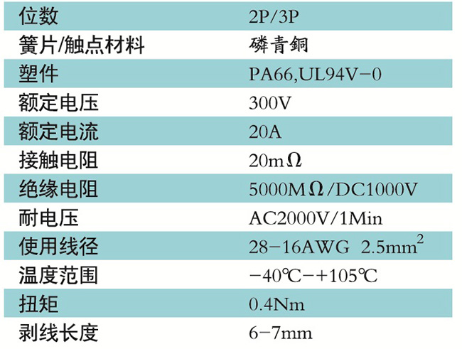 接線端子的絕緣材料用改性的尼龍(PA66),能達到或超過IEC947-7-1EN60947-7-1標準,阻燃等級達到UL94,V-0具有良好的電氣性能和機械性能。螺絲用高強度的鋼制成鍍鋅或鎳處理,導電體四方針用合金銅制成表面鍍錫,壓片采用彈性及極強的磷青銅表面鍍錫或鎳;壓線框用抗應力裂縫腐蝕的合金銅制成,這些金屬表面還鍍錫或鍍鎳加以保護。設計完全符合IEC60947-7-1.GB14048.7等標準。