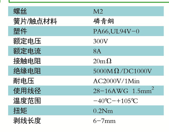 接線端子的絕緣材料用改性的尼龍(PA66),能達到或超過IEC947-7-1EN60947-7-1標準,阻燃等級達到UL94V-0具有良好的電氣性能和機械性能。螺絲用高強度的鋼制成鍍鋅或鎳處理,導電體四方針用合金銅制成表面鍍錫,壓片采用彈性及極強的磷青銅表面鍍錫或鎳;壓線框用抗應力裂縫腐蝕的合金銅制成,這些金屬表面還鍍錫或鍍鎳加以保護。設計完全符合IEC60947-7-1.GB14048.7等標準。